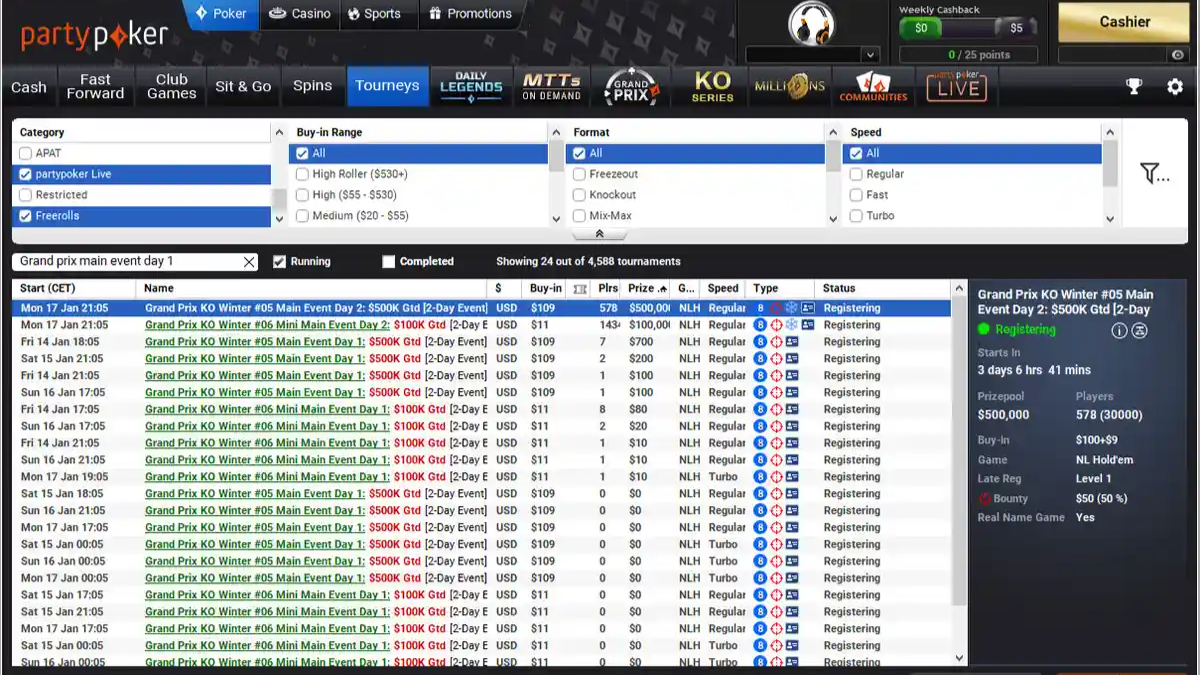 PartyPoker's Cashback program delivers rewards points based on rake. Points are accumulated through various games, like cash games, multi-table tournaments, Sit & Go, and spins, then converted into real cash weekly payments of up to $ 500.